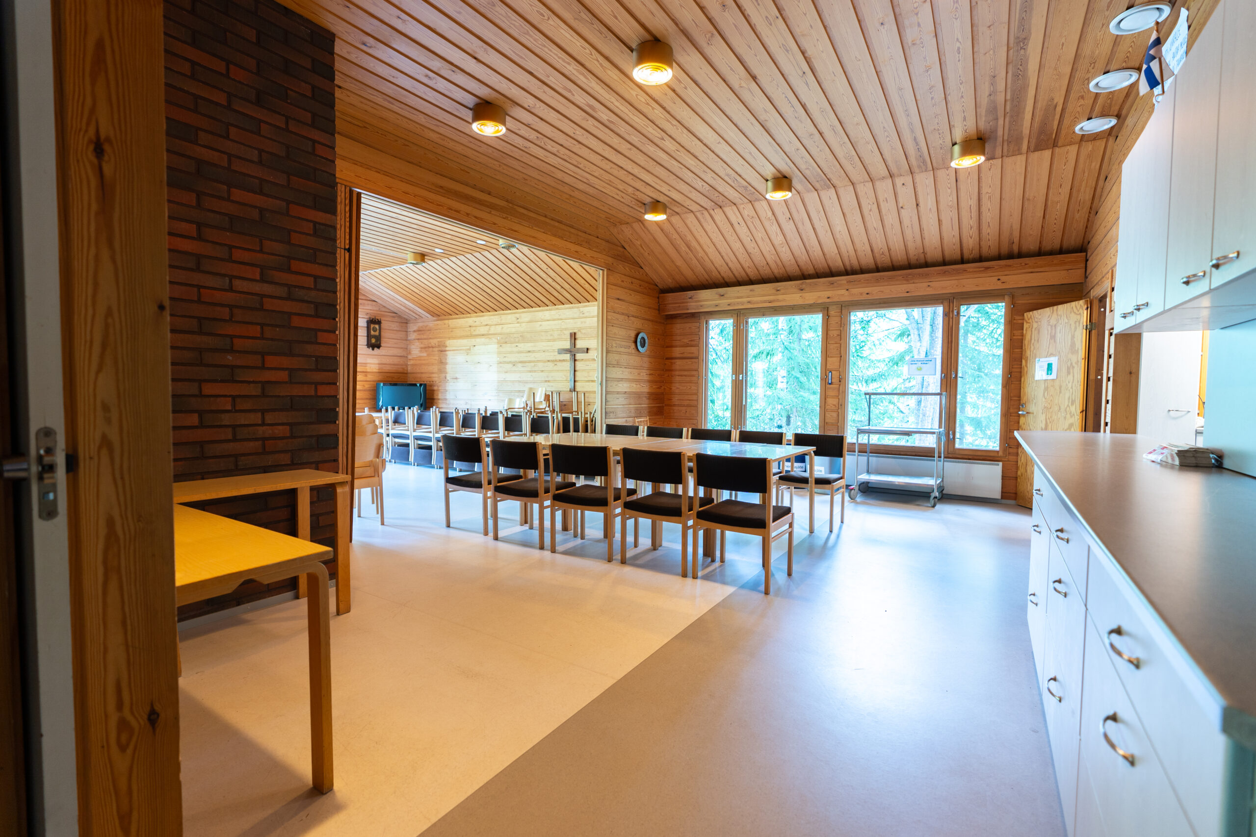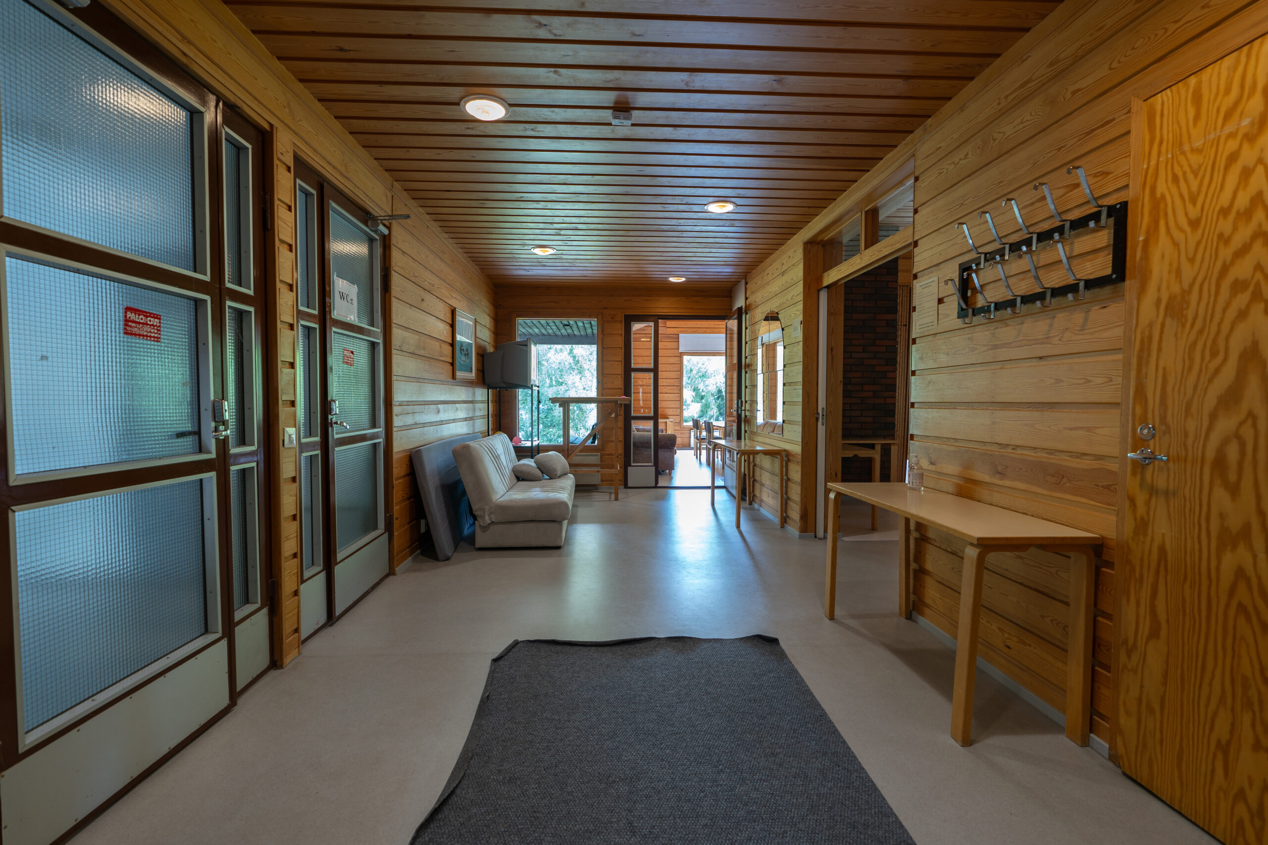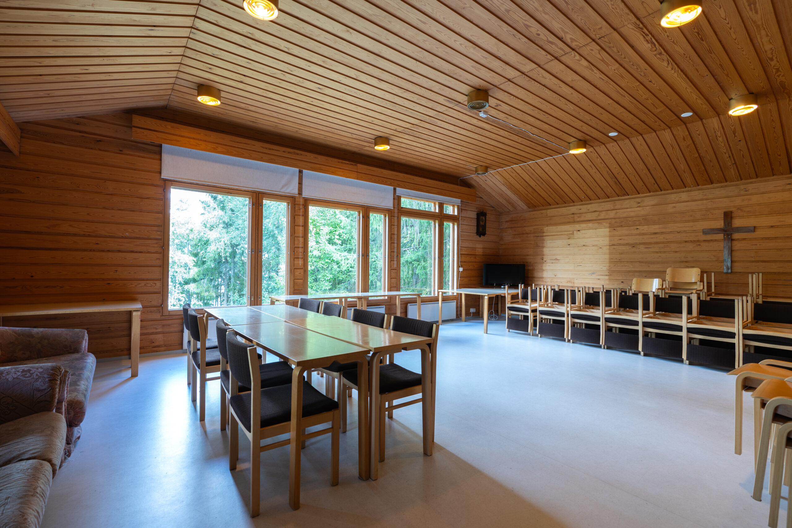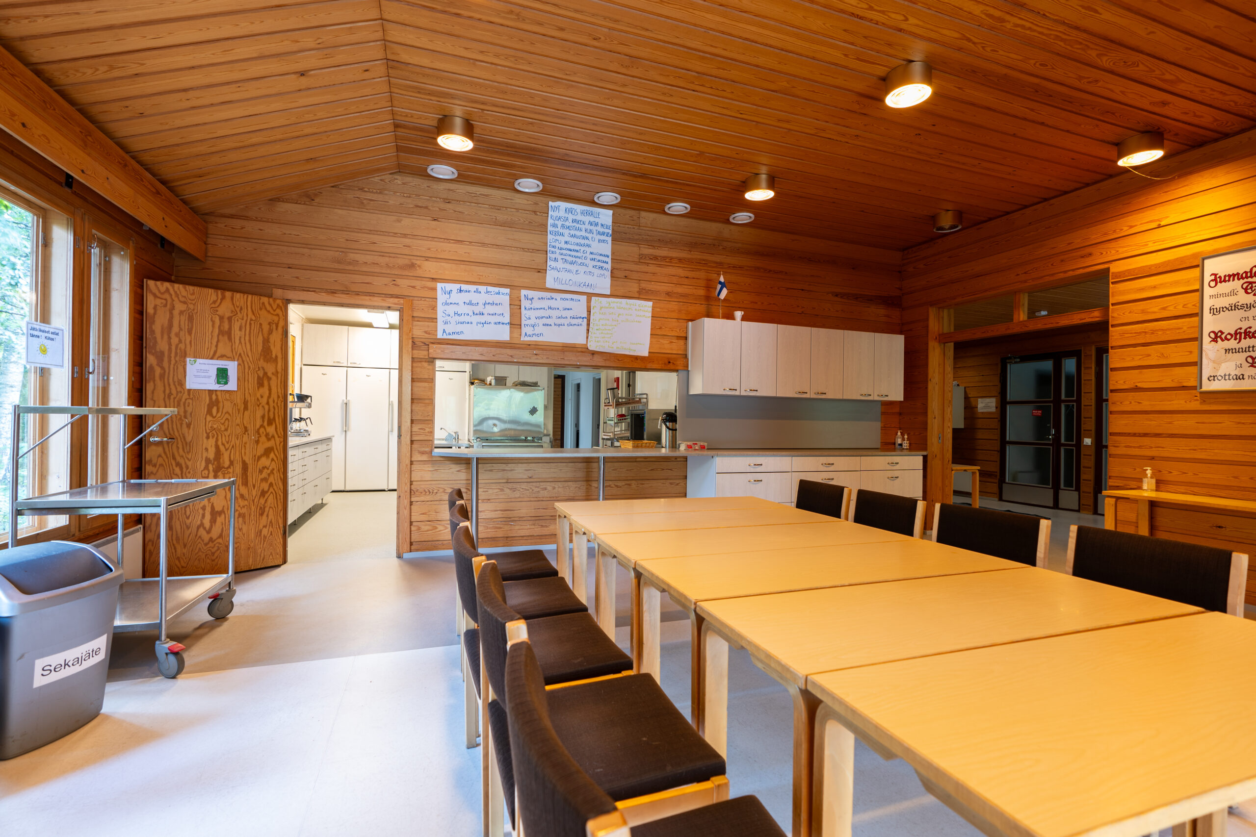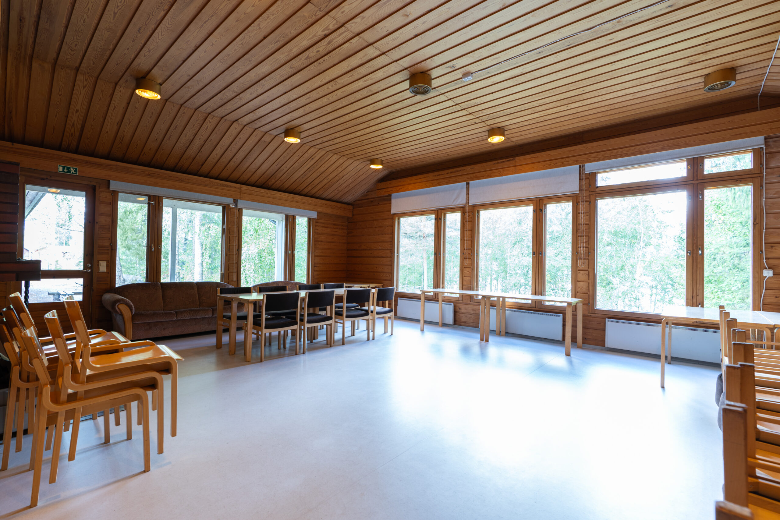 Päärakennuksessa sijaitsee majoitustilat, sali ja keittiö, josta näkymät Pääjärvelle ovat upeat. Sisäänkäynti on mahdollinen pyörätuolilla. AV-välineistöä ei leirikeskuksessa ole. WC-tilat löytyvät majoituskäytävältä. Päärakennuksessa on ainoastaan yksi suihku. Peseytymistiloina käytetään pääasiassa rantasaunan pesutiloja.
